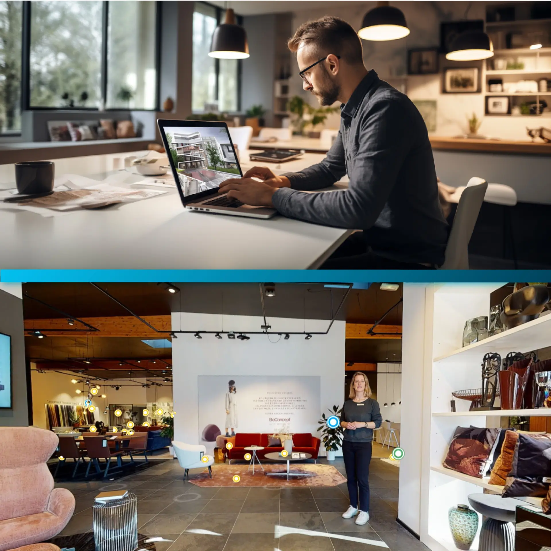 La visite virtuelle se décline en deux formats distincts : l’un utilise des images réelles pour une exploration authentique et détaillée des lieux, tandis que l’autre repose sur des rendus 3D pour créer des environnements personnalisés et interactifs. Elle est particulièrement adaptée pour des domaines tels que le divertissement, la formation et l’industrie,